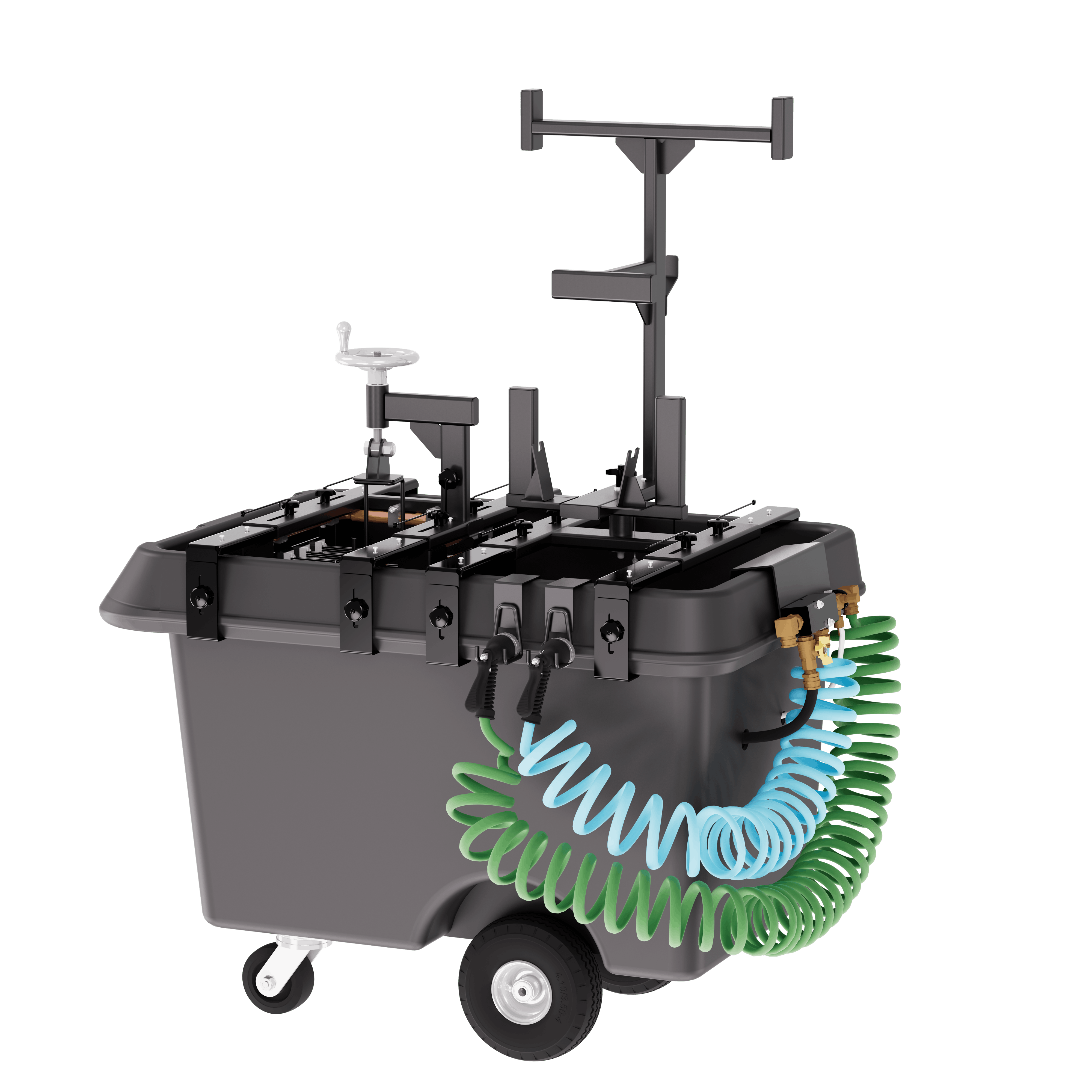 Units can be powered by a standard garden hose tap for station use or connected directly to a fire truck. A single truck line can power multiple washers simultaneously.